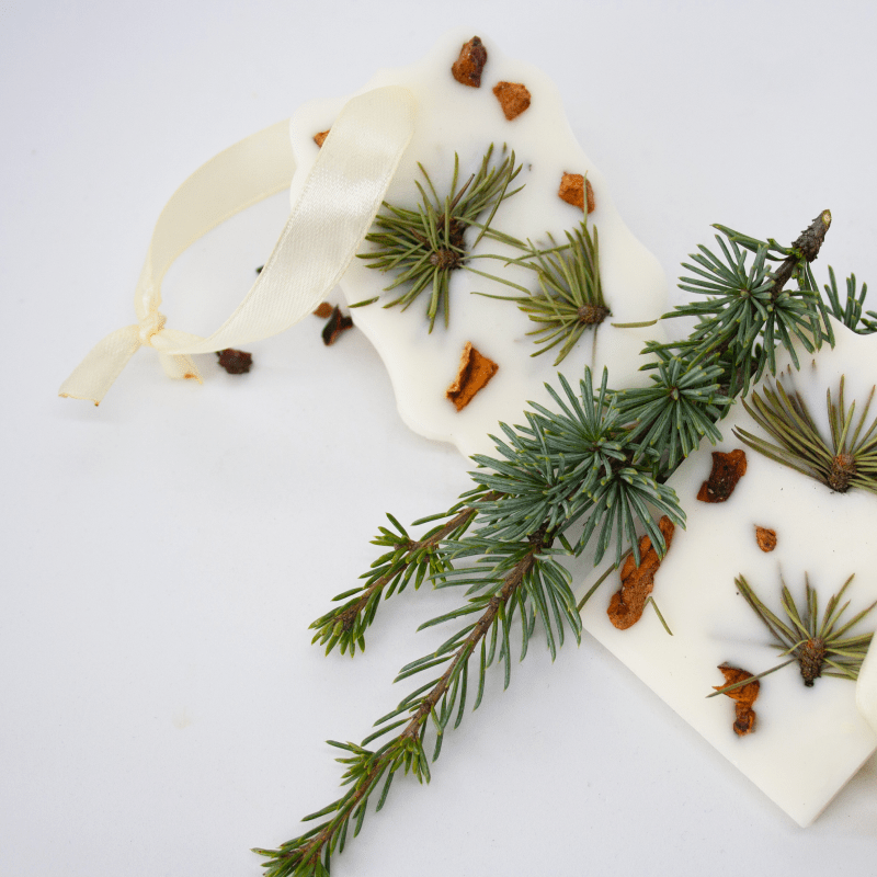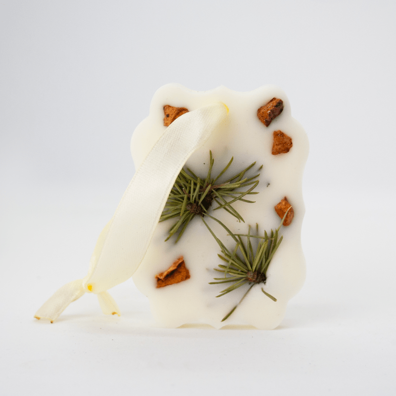 Mirisna voštana pločica je napravljena od sojinog i repičinog voska i dodato je mirisno ulje bora. Za dekoraciju su korišćeni sušeni vrhovi četinarskog drveta.